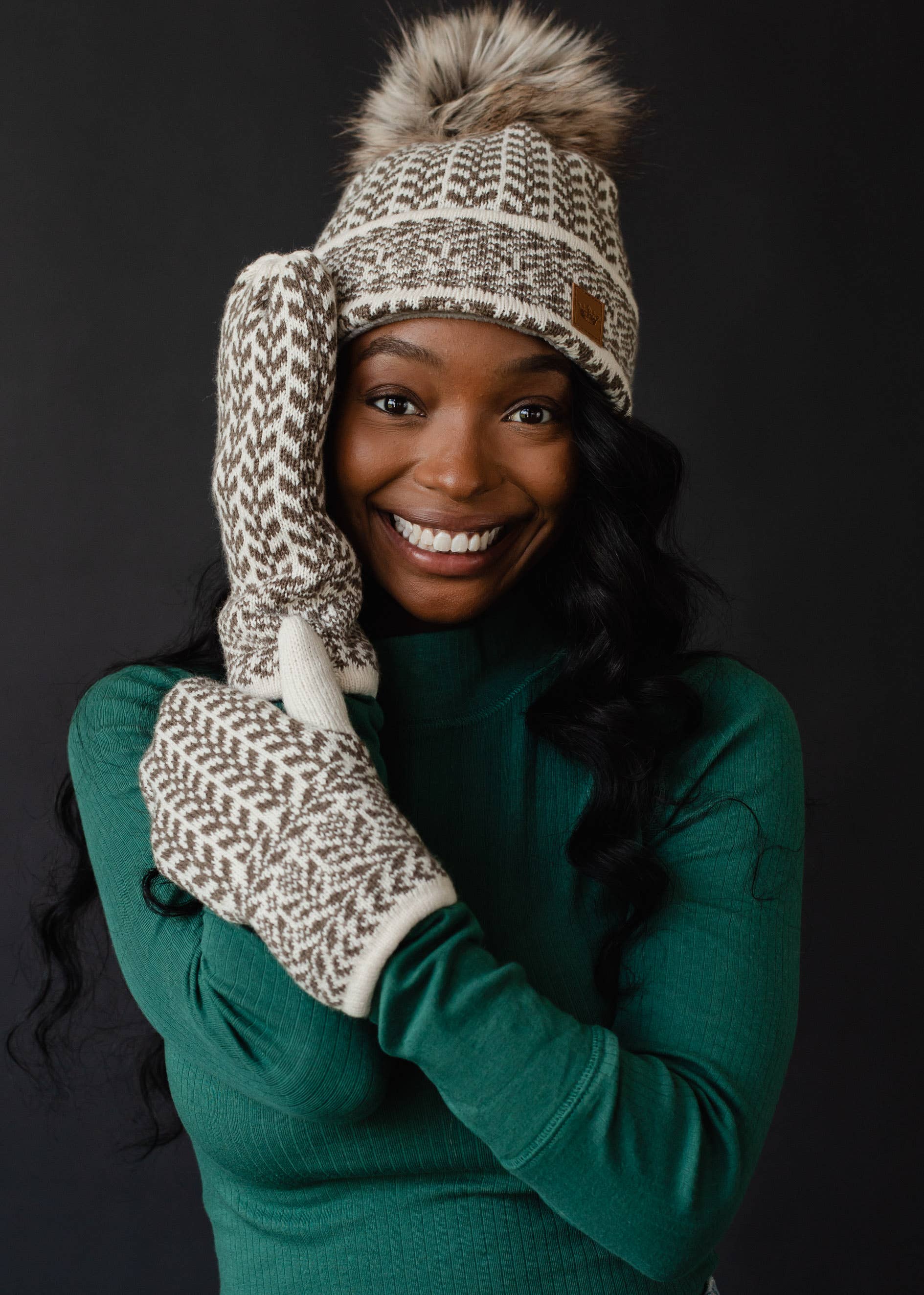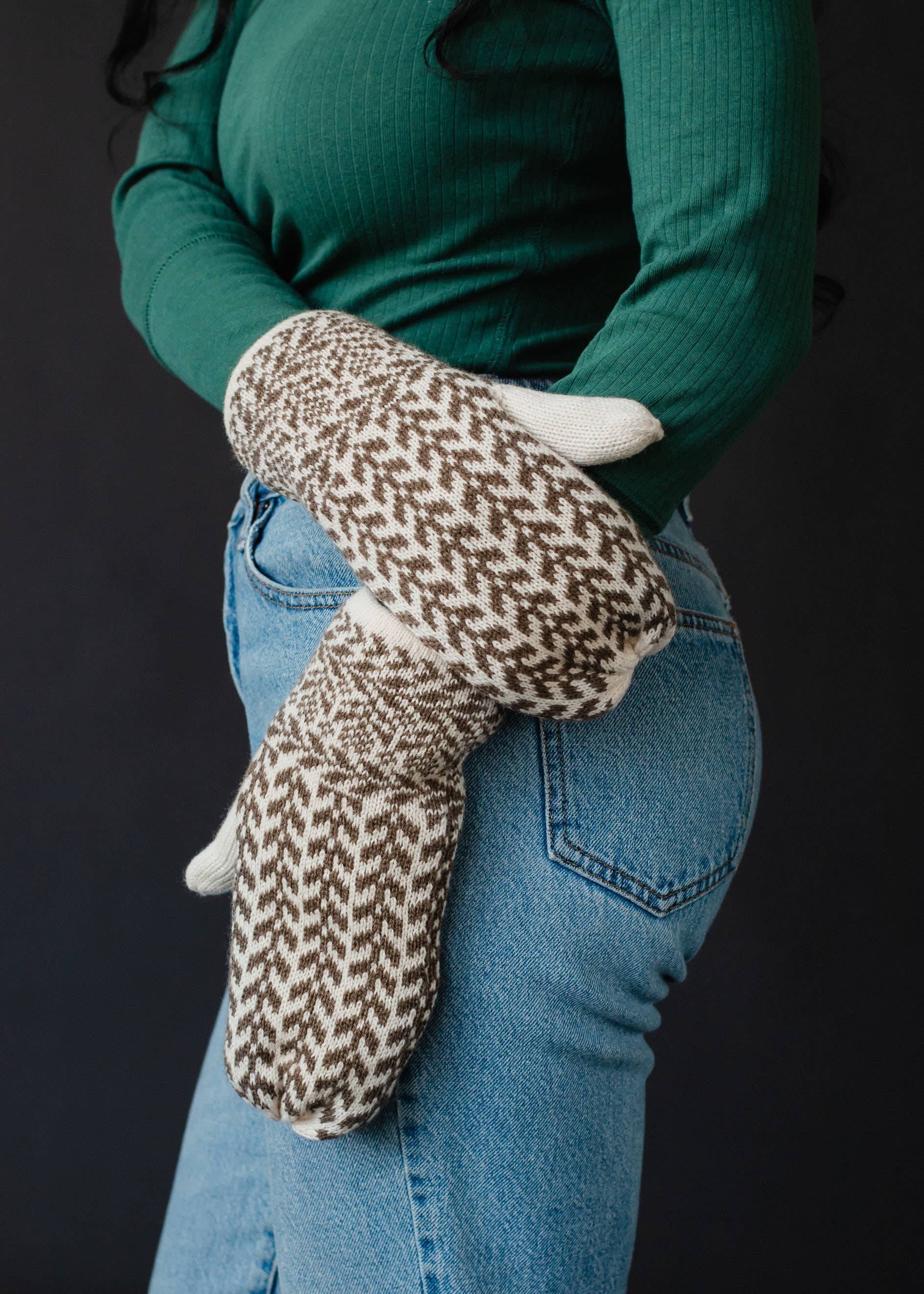 Beige & taupe patterned knit mittens