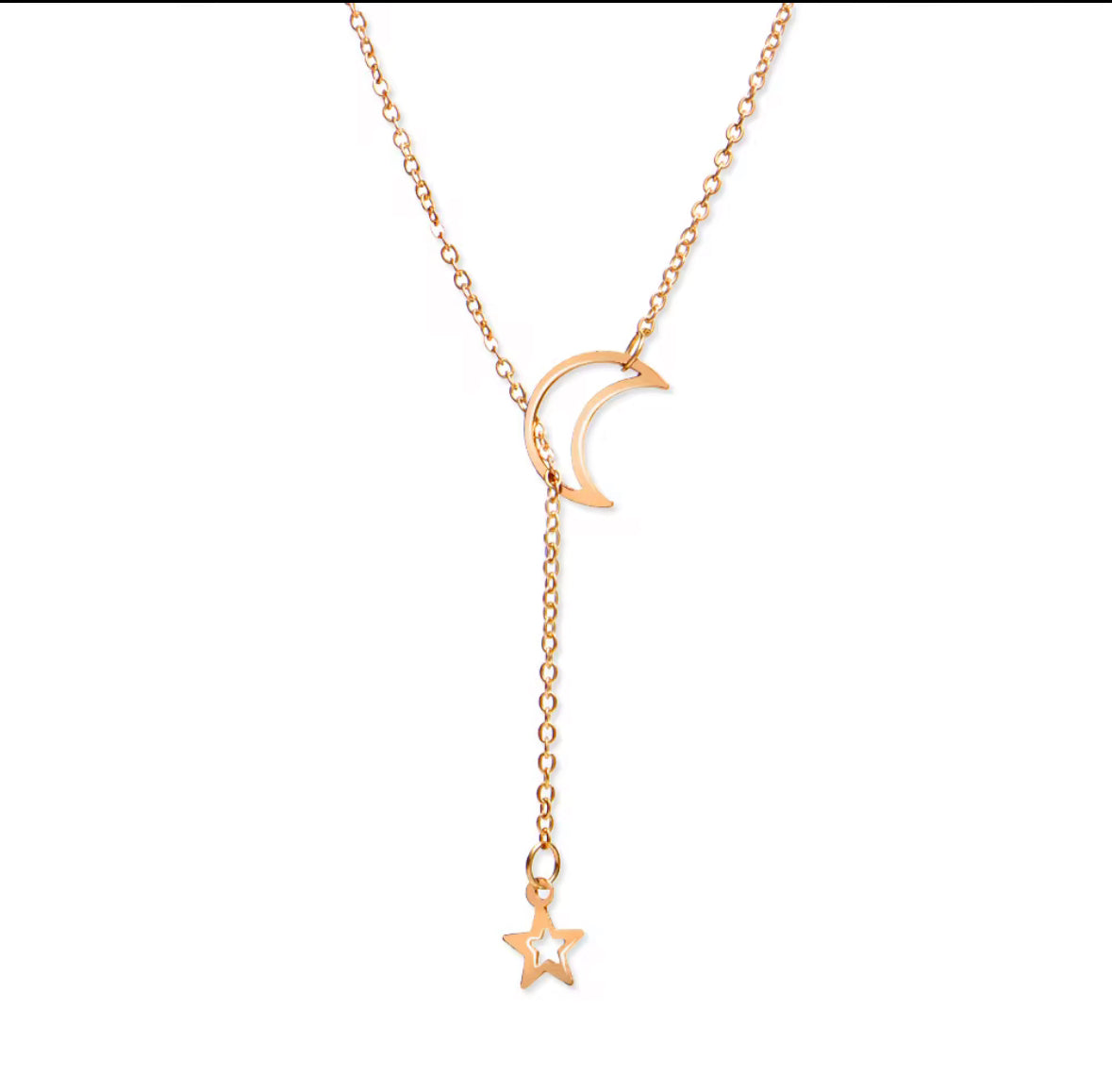 Shine bright with this chic celestial-inspired necklace, designed with a modern hollow moon pendant and a delicate dangling star adorned with sparkling zircon accents. Its elegant lariat style makes it a versatile accessory, perfect for layering or wearing solo as a statement piece.